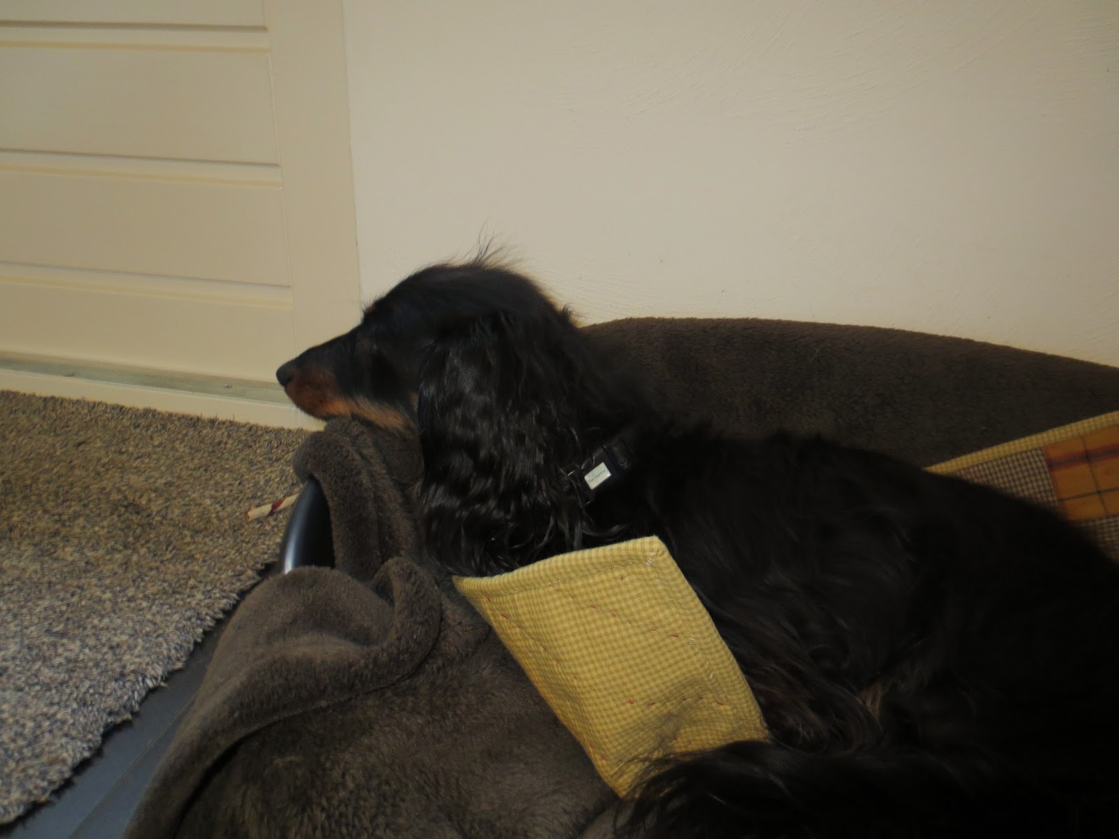 Mies tried to escape a few times to explore upstairs. She doesn't like stairs at our home, but when we're somewhere else she likes to explore the whole house. Curious dog.